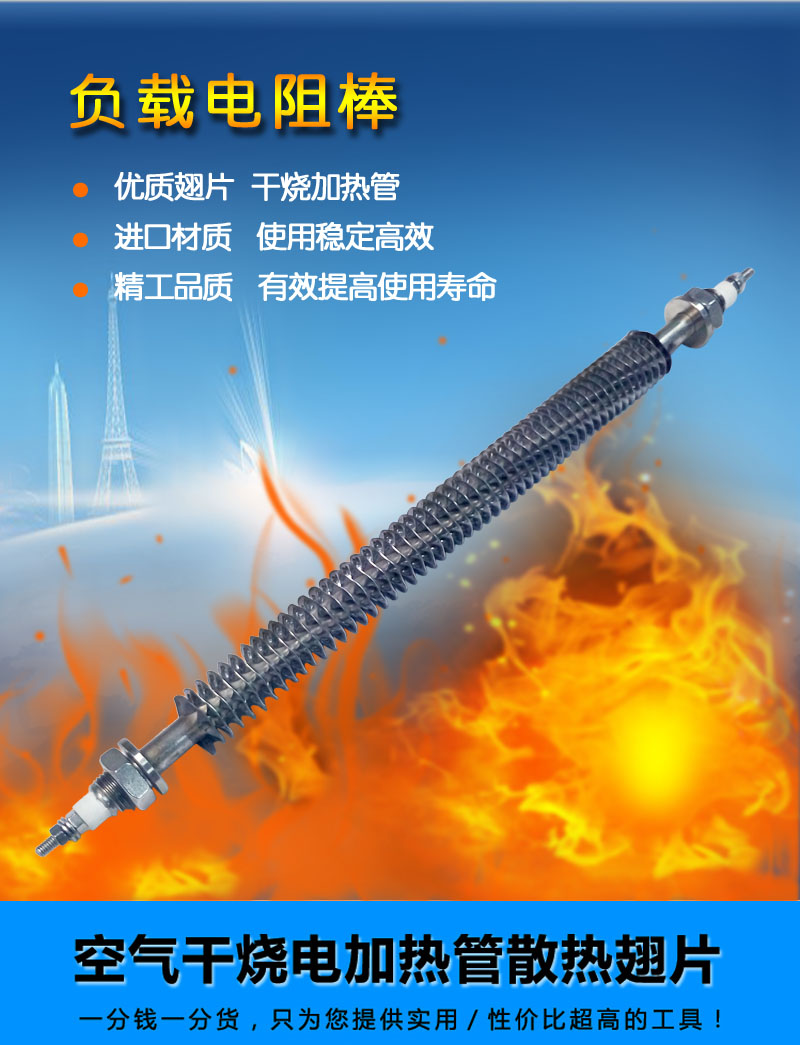測試負載電阻棒采用優(yōu)質(zhì)不銹鋼、進口氧化鏷粉、高電阻電熱合金絲、不銹鋼散熱片等材料,通過先進的生產(chǎn)設(shè)備和工藝制作而成,翅片電加熱管可以安裝在吹風(fēng)管道中或其它靜止、流動空氣的加熱場合。它與普通加熱管相比,散熱面積擴大了2~3倍,即翅片元件所允許的表面功率負荷是普通元件的3~4倍。由于元件的長度縮短,使得本身的熱損失減小,在相同的功率條件下,具有升溫快、發(fā)熱均勻、散熱性能好、熱效率高、使用壽命長、加熱裝置體積小,成本低等優(yōu)點。根據(jù)用戶要求進行了合理的設(shè)計,便于安裝。產(chǎn)品在機械制造、汽車、紡織、食品、家電等行業(yè),尤其在空調(diào)器風(fēng)幕行業(yè)得到廣泛應(yīng)用。