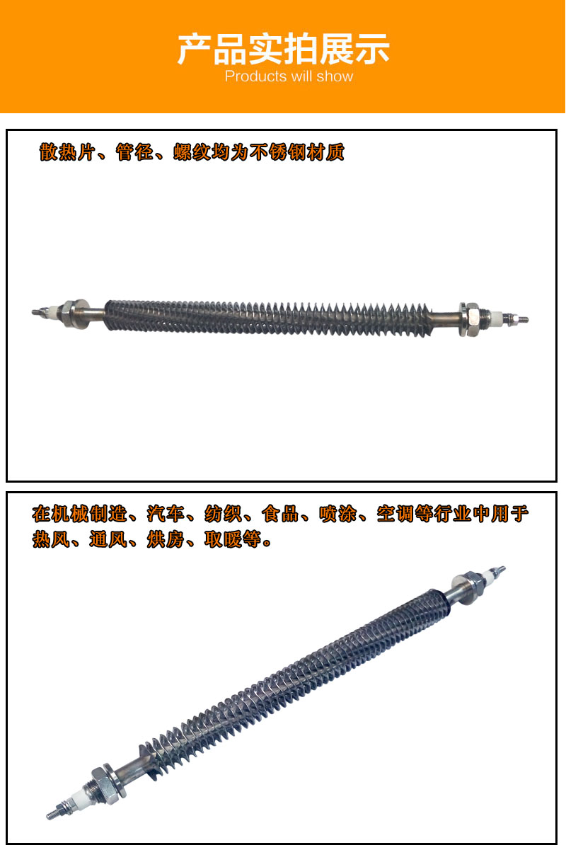 翅片電加熱管適用于烘箱、烘道加熱,一般加熱介質(zhì)為空氣。