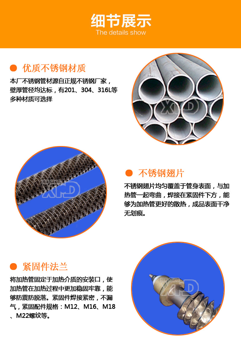 U型翅片加熱管采用優質不銹鋼、進口氧化鏷粉、高電阻電熱合金絲、不銹鋼散熱片等材料,通過先進的生產設備和工藝制作而成,翅片電加熱管可以安裝在吹風管道中或其它靜止、流動空氣的加熱場合。它與普通加熱管相比,散熱面積擴大了2~3倍,即翅片元件所允許的表面功率負荷是普通元件的3~4倍。由于元件的長度縮短,使得本身的熱損失減小,在相同的功率條件下,具有升溫快、發熱均勻、散熱性能好、熱效率高、使用壽命長、加熱裝置體積小,成本低等優點。根據用戶要求進行了合理的設計,便于安裝。產品在機械制造、汽車、紡織、食品、家電等行業,尤其在空調器風幕行業得到廣泛應用。
