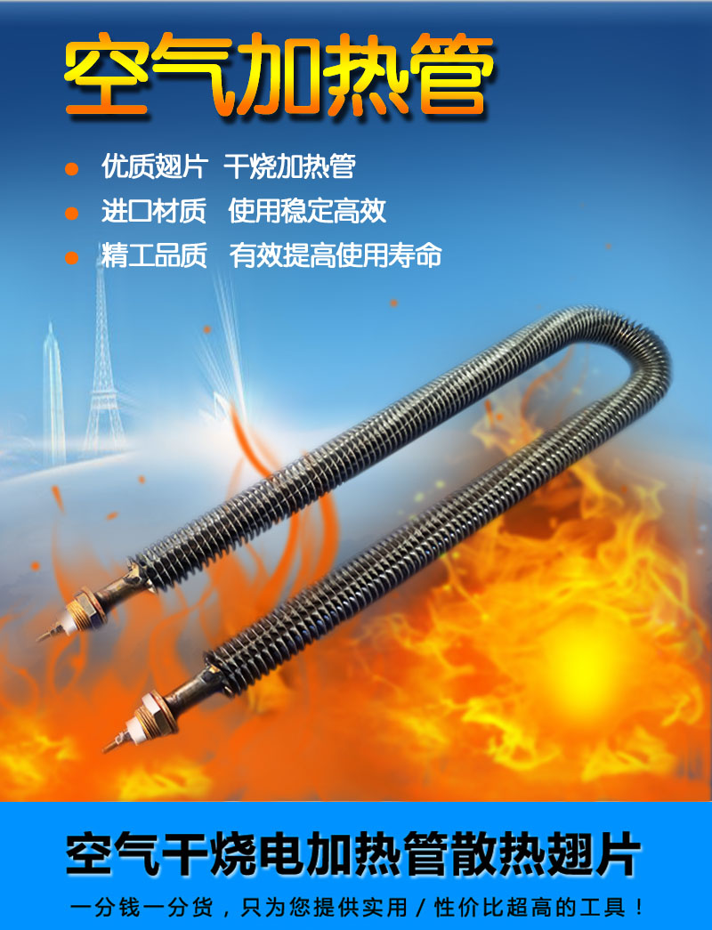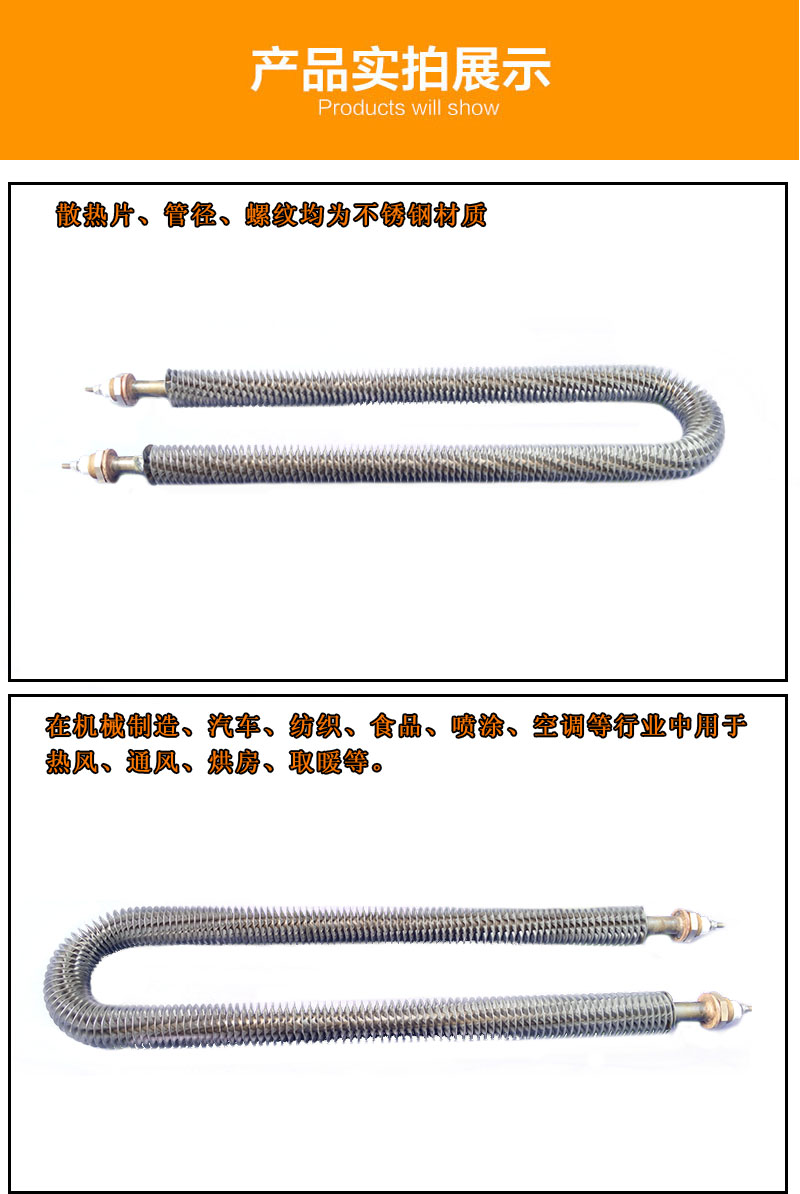 U型翅片加熱管采用優質不銹鋼、進口氧化鏷粉、高電阻電熱合金絲、不銹鋼散熱片等材料,通過先進的生產設備和工藝制作而成,翅片電加熱管可以安裝在吹風管道中或其它靜止、流動空氣的加熱場合。它與普通加熱管相比,散熱面積擴大了2~3倍,即翅片元件所允許的表面功率負荷是普通元件的3~4倍。由于元件的長度縮短,使得本身的熱損失減小,在相同的功率條件下,具有升溫快、發熱均勻、散熱性能好、熱效率高、使用壽命長、加熱裝置體積小,成本低等優點。根據用戶要求進行了合理的設計,便于安裝。產品在機械制造、汽車、紡織、食品、家電等行業,尤其在空調器風幕行業得到廣泛應用。