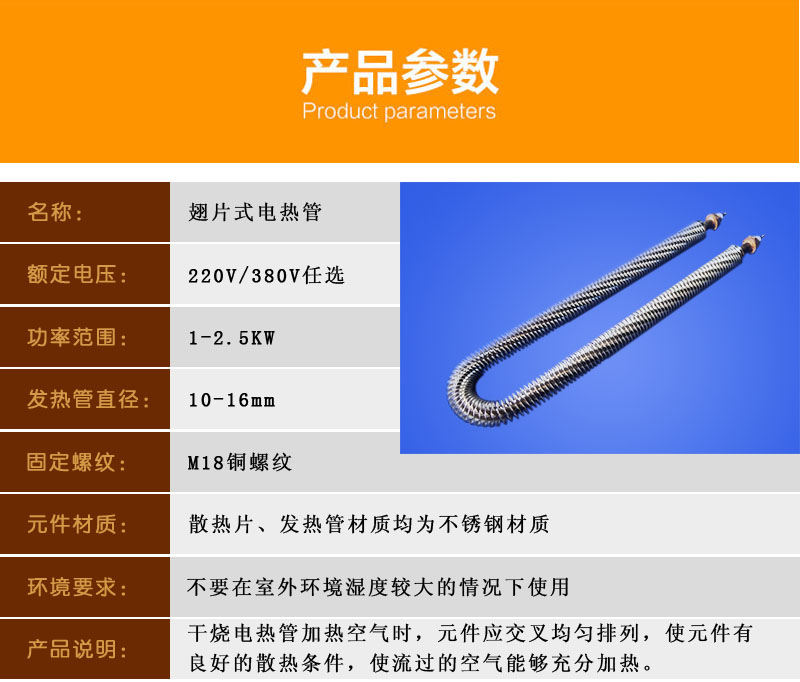 翅片電加熱管適用于烘箱、烘道加熱,一般加熱介質為空氣。